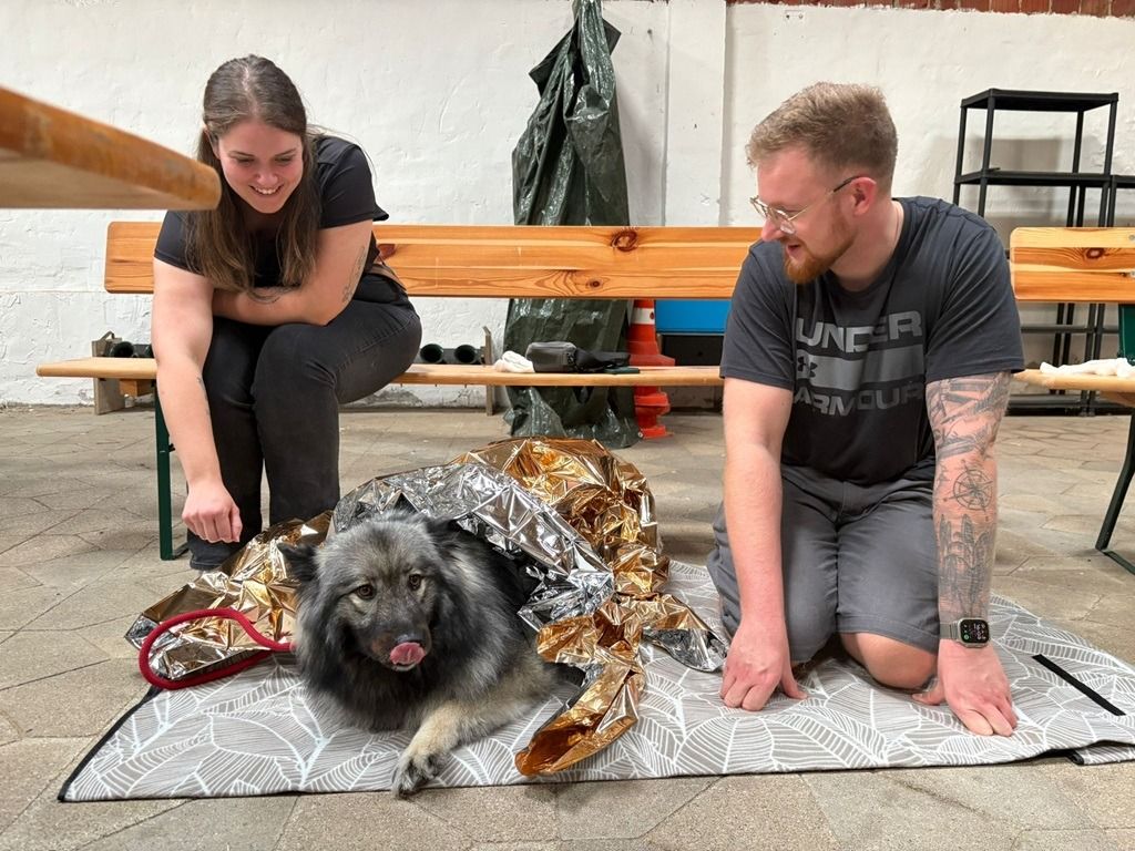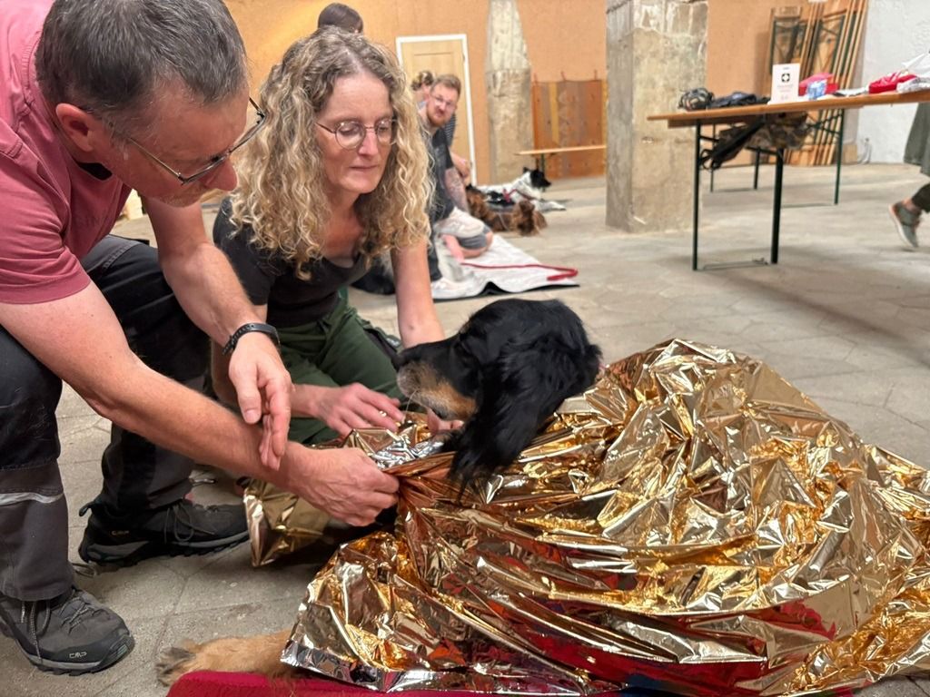 Von der Maulschlaufe über die Knisterdecke bis hin zum Anlegen eines Verbandes. Außerdem wurden Tragehilfen aus Stöcken und einer Jacke gebaut. Elke und Susanne haben die einzelnen Übungen begleitet. Die Teilnehmerzahl war begrenzt, weil alle Teilnehmer praktisch üben sollten.